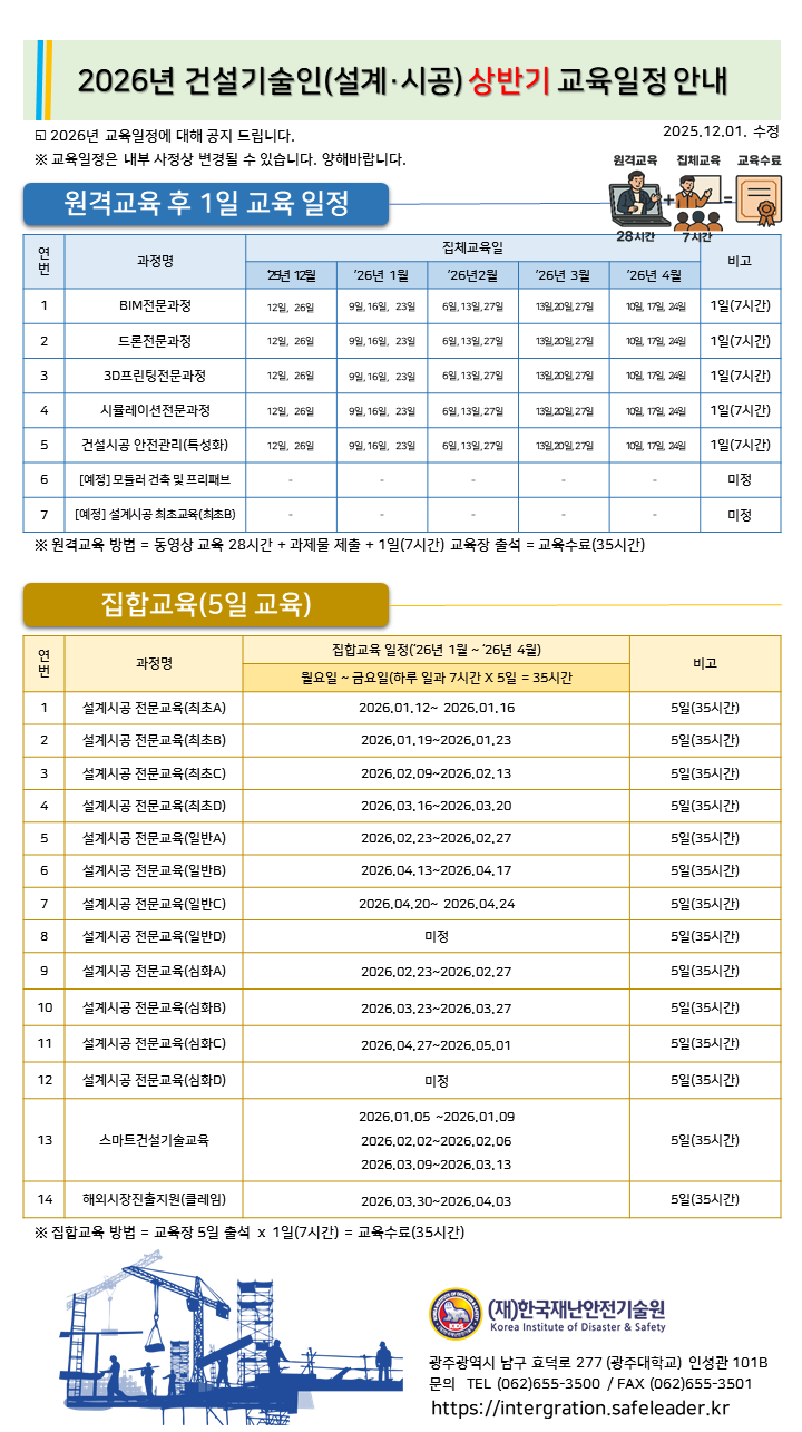 2026년 건설기술인 상반기(1월~4월) 교육일정에 대해 안내 드립니다.