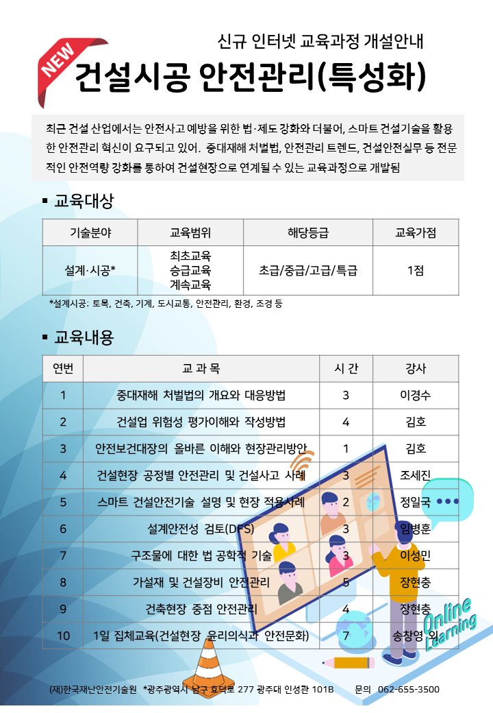 한국재난안전기술원에서는 최신 건설안전 트렌드와 스마트 건설기술을 반영한 인터넷 교육과정을 새롭게 개설하였습니다.